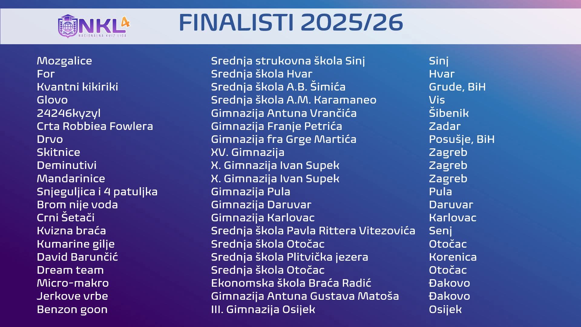 Četvrta sezona Nacionalne kviz lige srednjih škola se bliži kraju. Osam kola regularnog dijela je odigrano i poznate su ekipe koje će sudjelovati u finalu 13. i 14. ožujka u Kući umjetnosti Arsen.