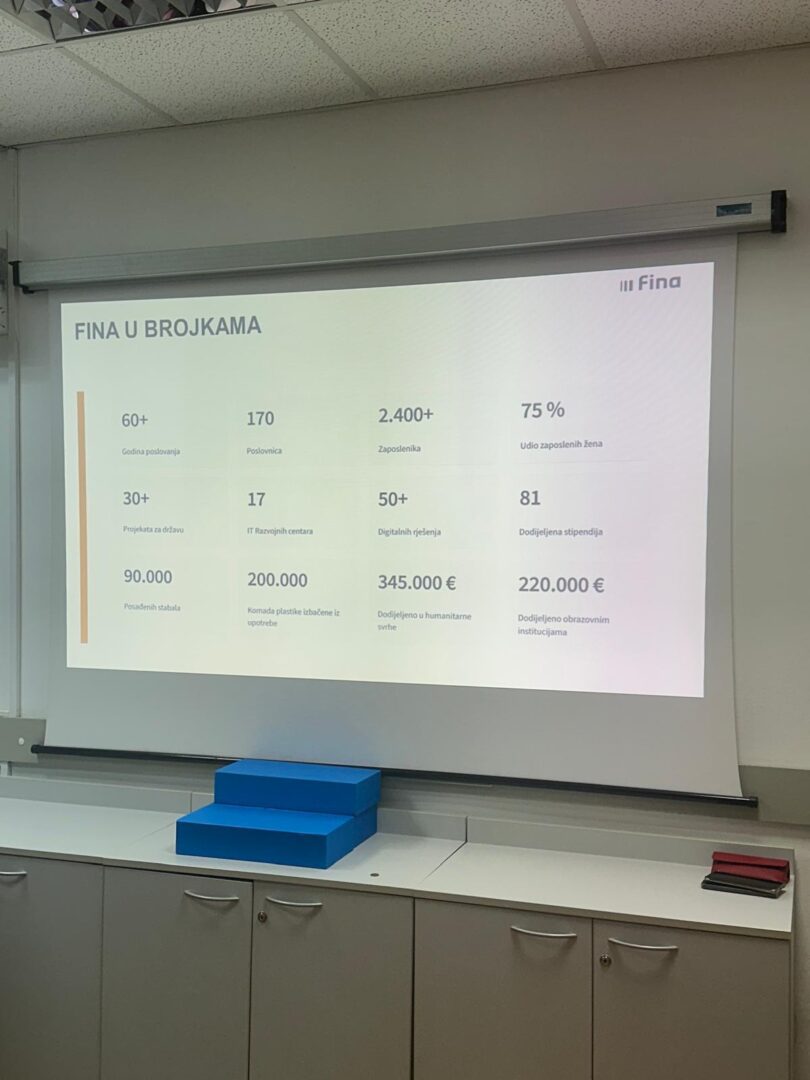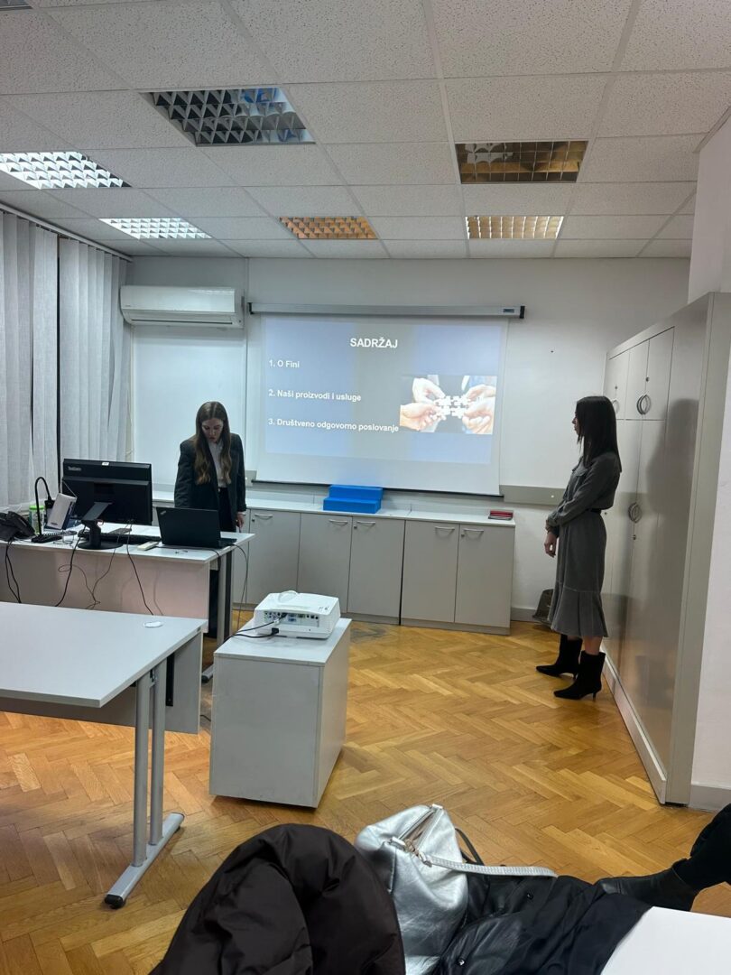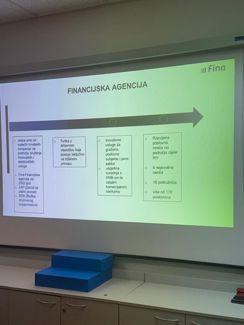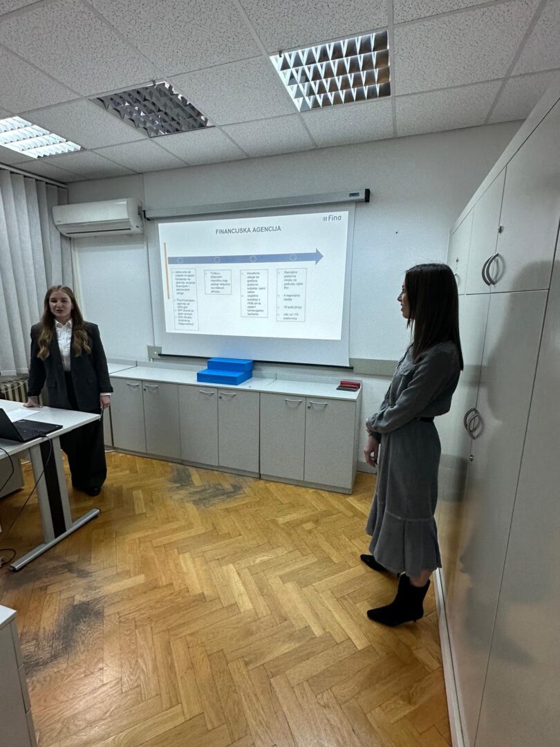 Dana 30.01.2026. godine učenici 3.d razreda Ekonomske škole i junior ambasadori EPAS programa, smjer komercijalist i njihovi nastavnici Jadranka Petković i Branka Dželalija sudjelovali su u terenskoj nastavi u Financijskoj agenciji (FINA). Terenska nastava organizirana je s ciljem upoznavanja učenika s radom jedne od ključnih institucija financijskog sustava Republike Hrvatske te povezivanja teorijskog znanja sa stvarnim poslovnim okruženjem.